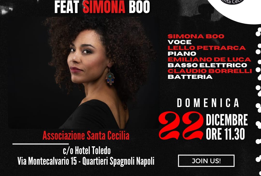 Domenica 22 Dicembre 2024 ore 11:30 Santa Cecilia Jazz Club Napoli c/o Hotel Toledo Via Montecalvario 15 – Quartieri spagnoli Napoli Info e prenotazioni Tel. 081406800 Freedom Jazz Trio feat Simona Boo Lello Petrarca – pianoforte Emiliano De Luca – basso elettrico Claudio Borrelli – batteria Special guest: Simona Boo – voce