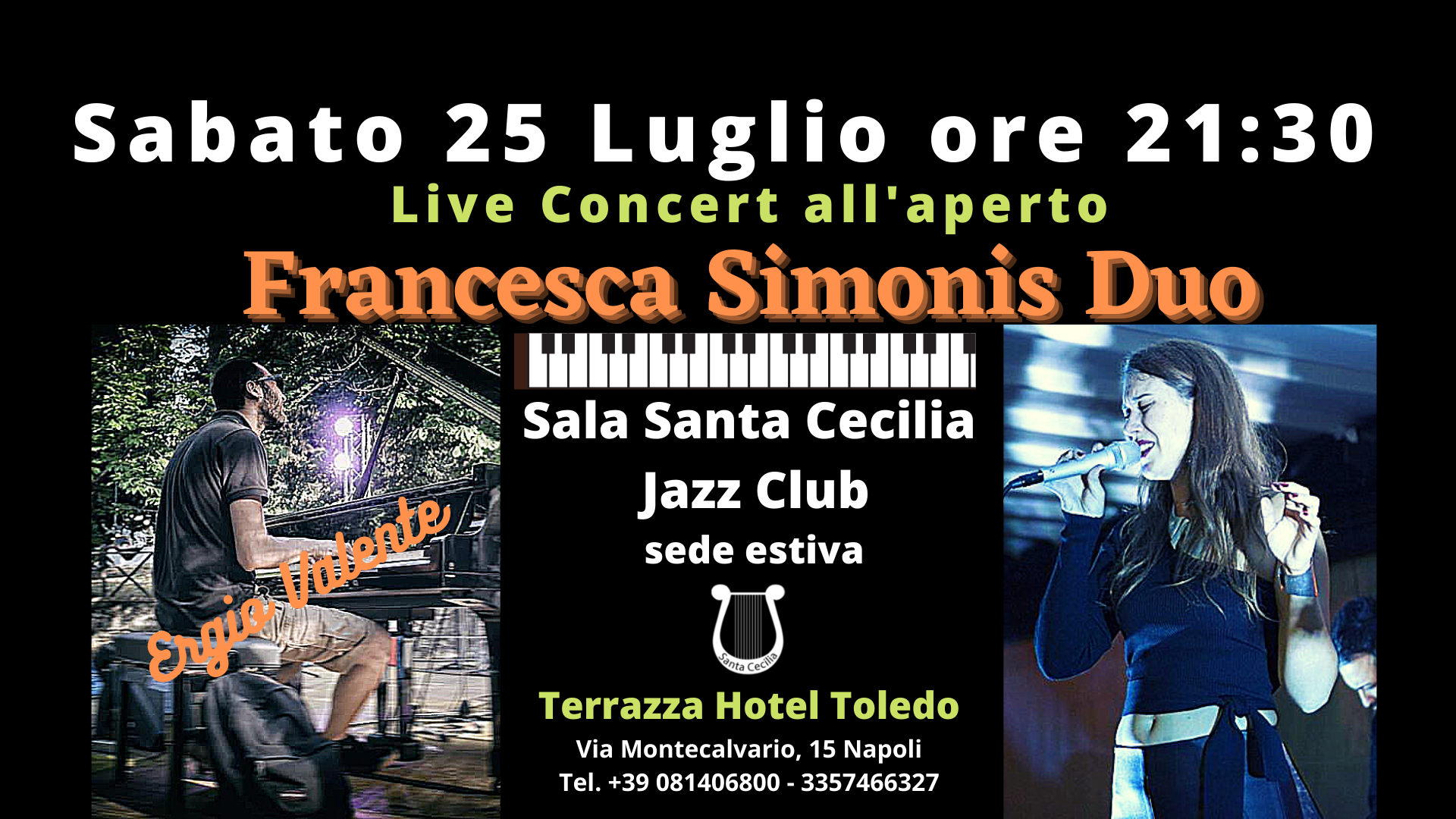 L’eccellente Duo campano che vede la partecipazione del talentuoso Ergio Valente e della promessa del canto jazz Francesca Simonis, propone nella magia dello scenario ai piedi della Certosa di San Martino, un repertorio che spazia tra gli evergreen del Jazz per arrivare ai brani più contemporanei. La cantante salernitana si è classificata seconda al Concorso Nazionale “Chicco Bettinardi 2020” eseguendo brani di difficile interpretazione la cui esecuzione ha suscitato interesse e riconoscimento della giuria e degli esperti del settore. La formazione è impreziosita dal pianoforte del raffinato Ergio Valente, pianista e compositore, con diverse formazioni in ambito jazz e latin, attualmentte docente ai seminari che si tengono al “Sapri Jazz Waves”.